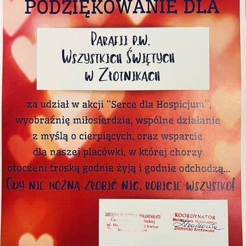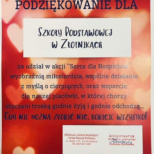 W tegoroczną, organizowaną przez kielecką Caritas akcją charytatywną „Serce dla Hospicjum”, włączyło się bardzo wiele osób z naszej Parafii, wiele rodzin, Koła Gospodyń Wiejskich, Rycerze Kolumba, a w sposób godny wielkiego uznania, Członkowie Szkolnego Koła Wolontariatu w Złotnikach na czele z p. Danutą Obłąk, p. Urszulą Madej oraz p. Anną Świerczyńską.